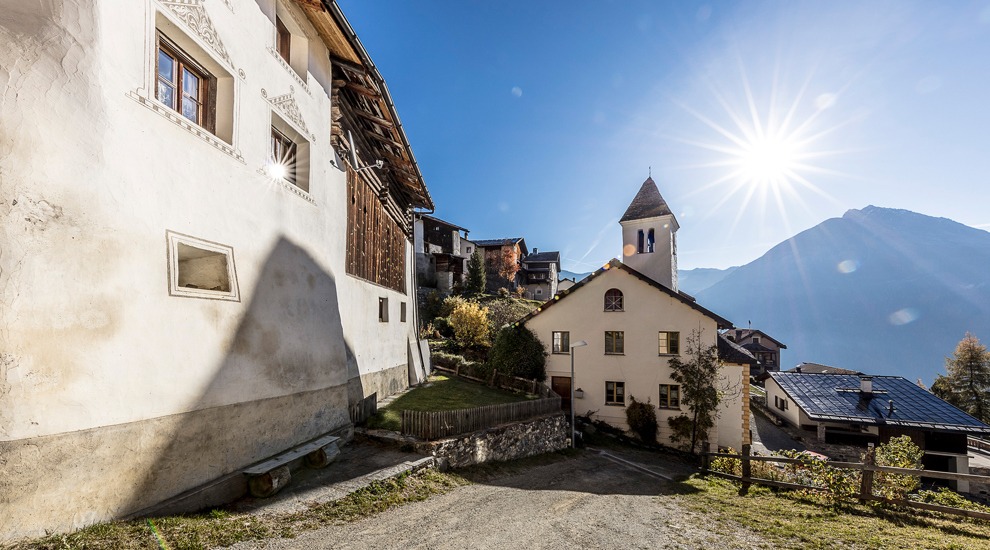 The post bus takes us to Ramosch, where we visit the second largest church in the canton of Graubünden. The journey continues to Vnà and Zuort, where we marvel at the wooden chapel designed by Wilhelm Mengelberg. In Sent, we visit the church with its neo-Gothic tower, which is visible from afar.